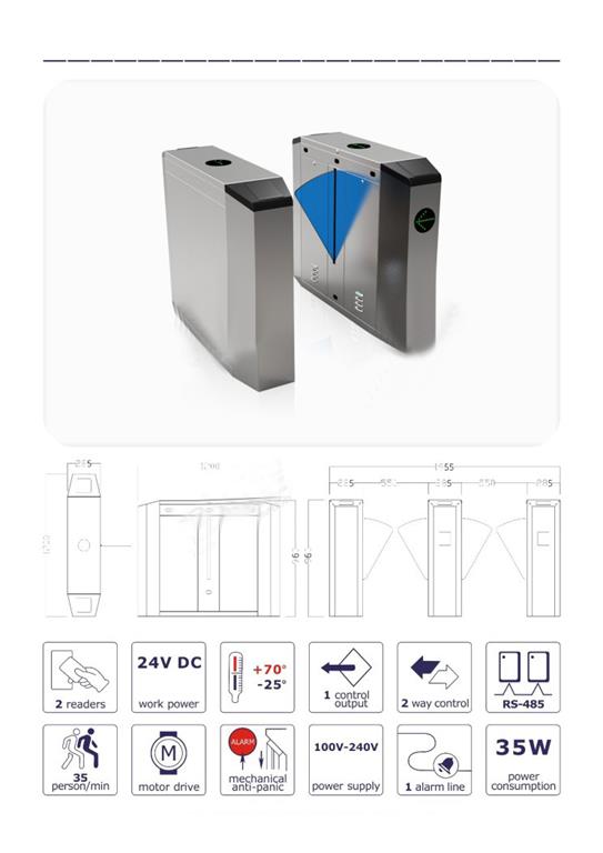 翼閘E242 1.尺寸:1200x280x960mm 2.解鎖時間: 0.2s 3.通行速度: 35 person/min 4.通道寬: ≤550mm 5.輸入電壓: 100V~240V 6.驅(qū)動電壓: 24v 7.環(huán)境溫度: -25~+70℃ 8.功率: 30w 9.開閘信號輸入: 干接點 10.產(chǎn)品包裝: 珍珠棉加紙箱 11.產(chǎn)品型號: