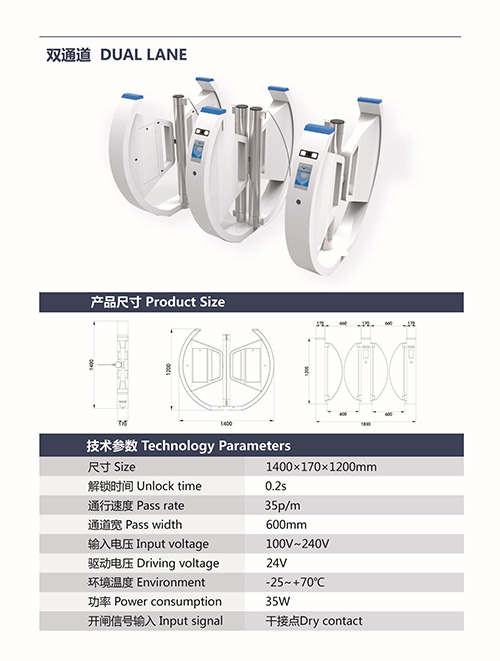 R3012 1.尺寸: 1400x170x1200mm 2.解鎖時間: 0.2s 3.通行速度: 35p/m 4.通道寬: 600mm 5.輸入電壓: 100v~240v 6.驅動電壓: 24v 7.環(huán)境溫度: -25~+70℃ 8.功率: 35w 9.開閘信號輸入: 干接點 10.產品包裝: 紙箱+珍珠棉 11.產品型號: R3012